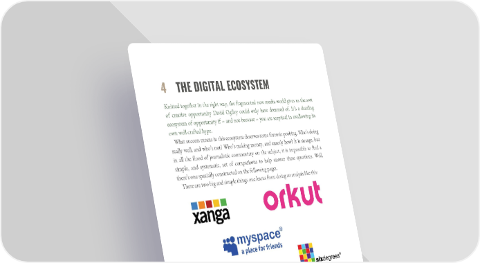 4 THE DIGITAL ECOSYSTEM Knitted together in the right way, the fragmented new media world gives us the sort of creative opportunity David Ogilvy could only have dreamed of. It’s a dazzling ecosystem of opportunity if – and not because – you are sceptical in swallowing its own well-crafted hype. What success means in this ecosystem deserves some forensic probing. Who’s doing really well, and who’s not? Who’s making money, and exactly how? It is strange, but in all the flood of journalistic commentary on the subject, it is impossible to find a simple, and systematic, set of comparisons to help answer these questions. Well, there’s one specially constructed on the following pages. There are two big and simple things one learns from doing an analysis like this: Seemingly invincible social platforms have quickly succumbed to fitter successors. Six Degrees had a short life, and barely made it to the start of the twenty-first century. Next, Myspace and Friendster appeared, and then moved aside for Facebook, while Xanga gave way to YouTube. Orkut, until recently the most popular network in parts of the world, has largely disappeared from sight. • For an advertiser, there’s no one-stop shop. Most of these media complement