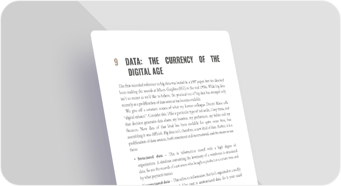 9 DATA: THE CURRENCY OF THE DIGITAL AGE The first recorded reference to big data was buried in a 1997 paper, but the idea had been making the rounds at Silicon Graphics (SGI) in the mid 1990s. While big data isn’t so recent as we’d like to believe, the practical use of big data has emerged only recently as a proliferation of data sources has become available. We give off a constant stream of what my former colleague Dimitri Maex calls “digital exhaust”. Consider this: I like a particular type of red socks. I buy them, and that decision generates data about my location, my preferences, my habits and my finances. Now data of that kind has been available for quite some time, but assembling it was difficult. Big data isn’t, therefore, a new kind of data. Rather, it is a proliferation of data sources, both structured and unstructured, and the means to use them: • Structured data – This is information stored with a high degree of organization. A database containing the inventory of a warehouse is structured data. So are the records of customers who bought a product at a certain time and by what payment means. • Unstructured data – This refers to information that isn’t organized in a readily machine-readable format. A blog post is unstructured data. So is your email inbox or your Facebook feed. Since nearly every action today creates data, that data must be stored somewhere in order to be useful. Enter “the Cloud”. The Cloud is nothing more than rented storage and computing power – much as early computers used timesharing to apportion processor cycles to individual users. But while that was the rationing of a scarce resource, the Cloud fosters the efficient and cost-effective distribution of an abundant one. Cloud servers, run by companies big and small all over the world, democratize the world of big data by reducing the cost of data storage and analysis. Companies can build and host their