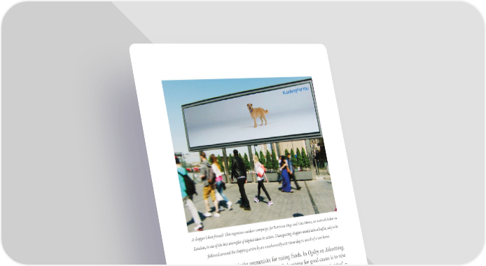 A shopper’s best friend? This ingenious outdoor campaign for Battersea Dogs and Cats Home, an animal shelter in London, is one of the best examples of digital ideas in action. Unsuspecting shoppers would take a leaflet, only to be followed around the shopping centre by an unashamedly cute rescue dog in search of a new home. Mobilizing support is the prerequisite for raising funds. In Ogilvy on Advertising, David Ogilvy asserts that the main purpose of advertising for good causes is to raise the money for them. At the end of the day nothing changes, and “digital giving” – enabled by an online giving platform – will take an increasingly larger share of the donations bowl. As digital communications became more sophisticated, it is clear that aggressive, unbridled fundraising can be counter-productive. Data protection legislation in some countries makes it illegal, too. Brave charities, such as the UK’s Royal National Lifeboat Institution, which have moved to opt-in only communications, have not faced disaster so far. But this highlights even more acutely the need for the issue itself to have the salience which can only come from creative communications; and also to treat the donor with maximum respect. The donor