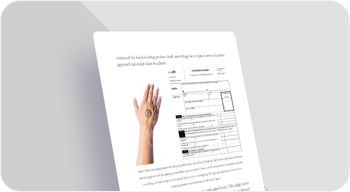 enhanced the hand-washing product itself, something that a typical communications approach can rarely claim to achieve. Smart ideas can nudge people into changing behaviours. Our client, Kimberly-Clark, used a big nudge to improve factory hygiene levels by applying a washable stamp to workers’ hands, which could only be removed by purposeful scrubbing. A small nudge can be equally clever, such as re-designing the language and layout of tax forms to encourage people to be more honest in what they report. An example of a smaller nudge can be seen on application forms. This nudge was to simply move the signature box to the start of the form, rather than the traditional position at the end, because such a move primes honesty and acts as a commitment device for applicants. A study by a car insurance company found that when they ran a randomized controlled trial (RCT) on over 13,000 applications, there was a 10 per cent increase in the honesty of the mileage reported in the “sign at the top” forms, which equated to an average of US$97 on annual insurance premiums. Such a nudge is fascinating not just because it is low cost and scientifically validated, but because it highlights how there are “unseen opportunities” to change behaviour by designing the world for how people really behave, rather than how we traditionally think they