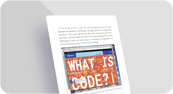 It’s too late for me to be a coder. But what I do appreciate is that the coder represents the foundation of advertising in the digital age. She or he assembles the foundations. There’s good code and bad code, in both moral and functional terms. And there’s creatively sensitive code such as the closely guarded algorithms used by high-frequency traders and search engines. In advertising, the programmer now defines whether you are good or bad at creative technology. Code underpins the digital age, but it need not be as mysterious as it seems. Paul Ford's "What is Code?" is primer for anyone who wants to dig in to code themselves. What makes a great programmer that we would want at Ogilvy & Mather? There’s the obvious fluency with the main languages, technology stacks, architectures or infrastructure, but our needs go beyond that. We need an elegant coder, one who can write for mobile and desktop, for low bandwidth and high. We need one with the social skills to work with clients, data scientists, account people and creatives alike. We need one sensitive to the importance of user experience, who is as allergic to kludgy interface as he or she is to kludgy code. Alternatively, you could have the most ham-fisted service-side engineer the world has ever seen so long as he is working with