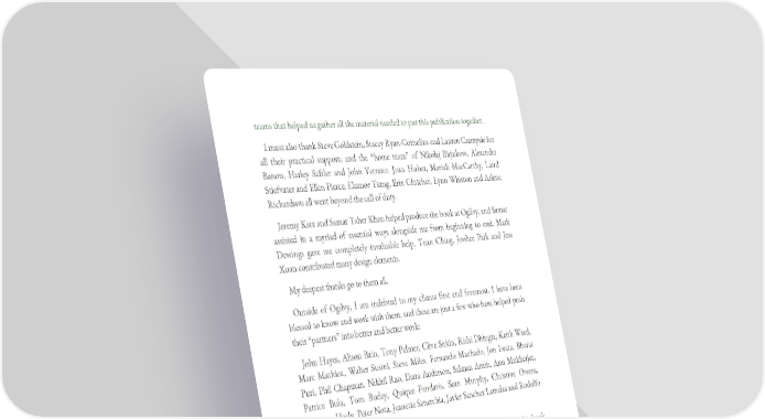 teams that helped us gather all the material needed to put this publication together. I must also thank Steve Goldstein, Stacey Ryan-Cornelius and Lauren Crampsie for all their practical support; and the “home team” of Nikolaj Birjukow, Alexander Banon, Harley Saftler and John Vetrano. Joan Huber, Mariah MacCarthy, Laird Stiefvater and Ellen Pierce, Eleanor Tsang, Erin Clutcher, Lynn Whiston and Arlene Richardson all went beyond the call of duty. Jeremy Katz and Samar Taher Khan helped produce the book at Ogilvy, and Samar assisted in a myriad of essential ways alongside me from beginning to end. Mark Dewings gave me completely invaluable help. Tuan Ching, Joohee Park and Jess Xuan contributed many design elements. My deepest thanks go to them all. Outside of Ogilvy, I am indebted to my clients first and foremost. I have been blessed to know and work with them, and these are just a few who have helped push their “partners” into better and better work: John Hayes, Alison Bain, Tony Palmer, Clive Sirkin, Rishi Dhingra, Keith Weed, Marc Mathieu, Walter Susini, Steve Miles, Fernando Machado, Jon Iwata, Bharat Puri, Phil Chapman, Nikhil Rao, Dana Anderson, Salman Amin, Ann Mukherjee, Patrice Bula, Tom Buday, Quique Pendavis, Sean Murphy, Christine Owens, Maureen Healy, Peter Nota, Jeanette Senerchia, Javier Sanchez Lamelas and Rodolfo Echeverria. It was Jonathan Goodman of Carlton Publishing who had the idea for this book, and then pushed and prodded until I finally wrote to him. I thank him, editors Alison Moss and Gemma Maclagan Ram, Art Director Russell Knowles and the whole team at Carlton for turning my untidy pile of pages and images into reality. Finally, there are others who have given freely of their time and knowledge: the “famous five” – Bob Greenberg, Akira Kagami, Martin Niesenholtz, Matias Palm- Jensen, Chuck Porter – and also Thomas Gensemer, Russell Davies, Surjit Bhalla, Phil Rumbold, Tim Piper, Adam Smith, Jeff Bowman, and Rob Norman.