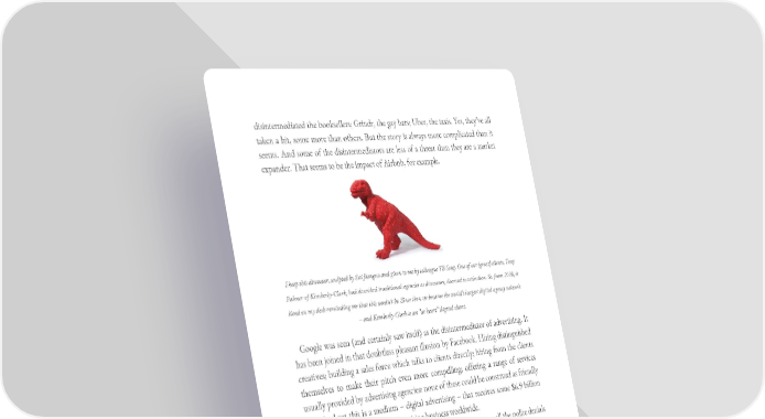 disintermediated the booksellers; Grindr, the gay bars; Uber, the taxis. Yes, they’ve all taken a hit, some more than others. But the story is always more complicated than it seems. And some of the disintermediators are less of a threat than they are a market expander. That seems to be the impact of Airbnb, for example. I keep this dinosaur, sculpted by Sui Jianguo and given to me by colleague TB Song. One of our (great) clients, Tony Palmer of Kimberly-Clark, had described traditional agencies as dinosaurs, doomed to extinction. So, from 2008, it lived on my desk reminding me that this needn’t be. Since then we became the world’s largest digital agency network – and Kimberly-Clark is an “at heart” digital client. Google was seen (and certainly saw itself) as the disintermediator of advertising. It has been joined in that doubtless pleasant illusion by Facebook. Hiring distinguished creatives; building a sales force which talks to clients directly; hiring from the clients themselves to make their pitch even more compelling; offering a range of services usually provided by advertising agencies: none of these could be construed as friendly acts. And yet this is a medium – digital advertising – that receives some $6.9 billion and growing a year from the advertising business worldwide. I can remember, at various conferences over the past few years, all the polite denials from Google and Facebook speakers. “Some mistake, surely?” Well, at the time of writing, not one of the offerings proffered by the digital platforms competing with us has resulted in anything like disintermediation. The reality is that they have just not been able to demonstrate an ability to do what we do, which is to build brands on the principles of best advice. Meanwhile they do have a data reservoir, with all the pent-up leverage that brings, which we could never replicate. The truth is that we need each other. The Digital Revolution is complex enough to require both them and us. We can