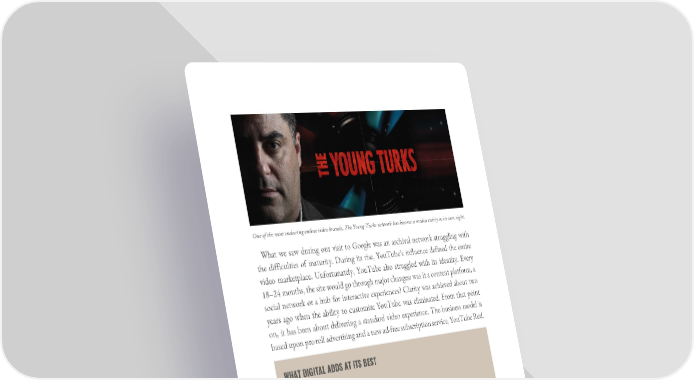 One of the most enduring online video brands, The Young Turks network has become a media entity in its own right. What we saw during our visit to Google was an archival network struggling with the difficulties of maturity. During its rise, YouTube’s influence defined the entire video marketplace. Unfortunately, YouTube also struggled with its identity. Every 18–24 months, the site would go through major changes: was it a content platform, a social network or a hub for interactive experiences? Clarity was achieved about two years ago when the ability to customize YouTube was eliminated. From that point on, it has been about delivering a standard video experience. The business model is based upon pre-roll advertising and a new ad-free subscription service, YouTube Red. WHAT DIGITAL ADDS AT ITS BEST Issue framing Intensity – leading to advocacy Buzz – word of mouth Topicality Participation Engagement The PewDiePies and Young Turks of the world form the basis of YouTube’s cultural relevance, and drive the platform’s traffic (along with music videos, which still make up a huge portion of the totals).
