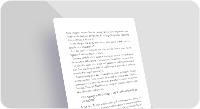 Some colleagues, a senior client and I recently spent a day meeting the two rivals, Google and Facebook, one after the other. It’s a very special experience – like visiting Athens and Sparta in the same day. To my colleague Rob Davis, who runs our video practice, it made concrete a general sense of impending battle. Rob has started to distinguish the video networks between those that are “ephemeral” and those that are “archival”. Ephemeral networks achieve maximum impact in the moment. They are designed for interaction. Video viewing is just one feature the network’s community uses. They have little search value, as they don’t prioritize the archiving and storage of video. Facebook, Instagram, SnapChat and Periscope are all examples of ephemeral networks. This category is growing fast. Archival networks give a place to host and arrange content specifically for the video viewing experience. These networks are designed for watching video. They have tremendous search impact and serve as the go-to place for someone seeking video. YouTube, Vimeo and DailyMotion are among the remaining archival networks. Most others have ceased operation. “The message is the message – and it can be influenced by the medium.” By late 2014, YouTube touted the delivery of 4 billion video views per day. No other platform came close. Facebook was delivering about 25 per cent as many videos. But by the time YouTube reached its 10th birthday in February 2015, something had changed. Facebook claimed it earned as many views as YouTube and would soon release data showing it had eclipsed YouTube’s daily viewership. Facebook’s dramatic increase in video views was driven by technological tweaks rather than a groundswell of viewership. They introduced auto-play videos, which would start playing as the user slowly scrolled over them, and began counting these automatic engagements as a “view”, a sleight of hand that immediately doubled the daily view count. In contrast, YouTube only counted a view when the user clicked the play button. The new strategy essentially doubled views overnight.