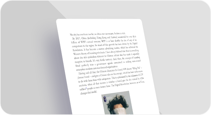 No city has ever been too far, no client ever too remote, for him to visit. By 2017, China (including Hong Kong and Taiwan) accounted for over $1.6 billion of WPP’s annual revenue; WPP is at least double the size of any of its competitors in the region. So much of that growth has been driven by the Digital Revolution. It has become a mature advertising market, which has enforced the Western theory of branding wholesale. I have always believed that there is something about the rich symbolism inherent in Chinese culture that has made it especially receptive to brands. It’s very fertile territory. And, then, the concept of branding fitted perfectly into a government agenda committed to making state-owned enterprises modern customer-focused organizations. Having said all that, the Chinese characters for brand denote “Ming Pai” – famous brand – and give a Chinese take on the concept, which has been rather more to do with fame than with uniqueness. This is epitomized by the infamous CCTV auctions, when all that matters is whether a brand gets the slot viewed by 130+ 1 million people at once: instant fame. The Digital Revolution, however, as we’ll see, changes that model. We created the signature HelloMoto campaign for Motorola from China in 2004, then ran it widely in the US. It marks the beginning of a shift in seeing China as not just a huge target market, but an enormously creative one.