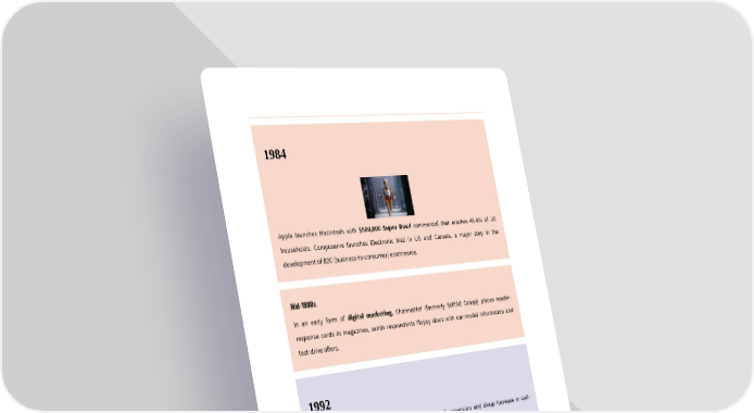 1984 Apple launches Macintosh with $900,000 Super Bowl commercial that reaches 46.4% of US households. Compuserve launches Electronic Mall in US and Canada, a major step in the development of B2C (business-to-consumer) ecommerce. Mid-1980s In an early form of digital marketing, ChannelNet (formerly SoftAd Group) places reader- response cards in magazines, sends respondents floppy discs with car-model information and test-drive offers. 1992 SMS messaging arrives on heels of 2G mobile network expansion and sharp increase in cell- phone use. 1993 Clickable web ad sold by Global Network Navigator (GNN) to law firm Heller, Ehrman, White, & McAuliffe, linking directly to firm’s website. Questionable whether it was a “clickable banner ad” or just a link. Publishers such as Condé Nast and Time Inc. ramp up website development.