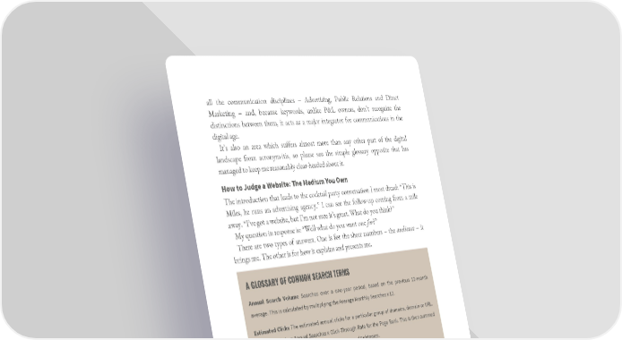 all the communication disciplines – Advertising, Public Relations and Direct Marketing – and, because keywords, unlike P&L owners, don’t recognize the distinctions between them, it acts as a major integrator for communications in the digital age. It’s also an area which suffers almost more than any other part of the digital landscape from acronym-itis, so please see the simple glossary opposite that has managed to keep me reasonably clear-headed about it. How to Judge a Website: The Medium You Own The introduction that leads to the cocktail party conversation I most dread: “This is Miles, he runs an advertising agency.” I can see the follow-up coming from a mile away. “I’ve got a website, but I’m not sure it’s great. What do you think?” My question in response is: “Well what do you want one for?” There are two types of answers. One is for the sheer numbers – the audience – it brings me. The other is for how it explains and presents me. A GLOSSARY OF COMMON SEARCH TERMS Annual Search Volume Searches over a one-year period, based on the previous 12-month average. This is calculated by multiplying the Average Monthly Searches x 12. Estimated Clicks The estimated annual clicks for a particular group of domains, domain or URL. Estimated Clicks = Annual Searches x Click-Through Rate for the Page Rank. This is then summed up for aggregate views across Categories, Topics and Subtopics. Opportunity Clicks The estimated increase in annual clicks (by Category, Topic, Subtopic or Keyword). This involves a complex calculation that evaluates current client and competitor Page Rank as well as domains too well-entrenched to be dethroned to establish a target goal rank for each keyword. Opportunity Clicks = future clicks minus current Estimated Clicks. Page Rank Refers to the organic ranking position on Google. Page 1 = Position 1–10; Page 2 = Position 11–20. This data is pulled from a third-party tool that captures a snapshot of ranking positions at a given date and time.