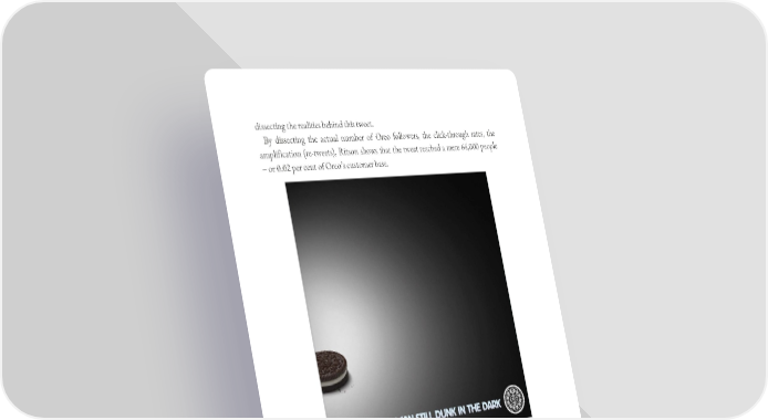 dissecting the realities behind this tweet. By dissecting the actual number of Oreo followers, the click-through rates, the amplification (re-tweets), Ritson shows that the tweet reached a mere 64,000 people – or 0.02 per cent of Oreo’s customer base. A social media team at the 2013 Super Bowl had the nerve, the agility and the creativity to take advantage of a blackout with this tweet, and then hyped it indefatigably. It provoked headlines such as “How Oreo’s Blackout Tweet