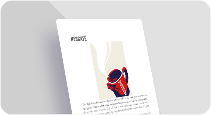 NESCAFÉ The digital case histories that tend to achieve profile in the trade press have intrinsic sex appeal. They are often small, sometimes interesting, but not always consequential. So for this entry into the Hall of Fame I have deliberately chosen a much more complex and much less apparently sexy example of digital transformation. It’s got a flavour of empire strikes back. When Nestlé, the ultimate multinational, went about driving digital thinking into the hearts and minds of its global networks, it did so with earnestness, discipline and missionary zeal. It was not a question of letting a “hundred flowers bloom”, but rather the opposite. They did bloom in the early days of the digital revolution: thousands of campaigns, in hundreds of markets, none scaled, none learning from each other, the sum of many parts in no way realized the promise of the cumulative investment. In 2011 Nestlé set itself the goal of being the No. 1 fast-moving consumer goods player in leveraging digital and social media to build brands and delight customers. It