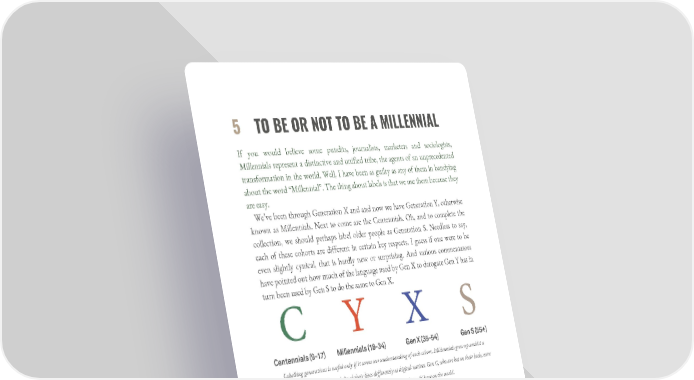 5 TO BE OR NOT TO BE A MILLENNIAL If you would believe some pundits, journalists, marketers and sociologists, Millennials represent a distinctive and unified tribe, the agents of an unprecedented transformation in the world. Well, I have been as guilty as any of them in bandying about the word “Millennial”. The thing about labels is that we use them because they are easy. We’ve been through Generation X and and now we have Generation Y, otherwise known as Millennials. Next to come are the Centennials. Oh, and to complete the collection, we should perhaps label older people as Generation S. Needless to say, each of these cohorts are different in certain key respects. I guess if one were to be even slightly cynical, that is hardly new or surprising. And various commentators have pointed out how much of the language used by Gen X to derogate Gen Y has in turn been used by Gen S to do the same to Gen X. Labelling generations is useful only if it serves our understanding of each cohort. Millennials grew up amidst a Digital Revolution and have defined their lives differently as digital natives. Gen C, who are hot on their heels, were “born digital”. We’re yet to see the impact they will have on the world. But what does make Millennials very different is that they are the generation which has coincided with the Digital Revolution. They are the first digital natives. Well, not even that really: at the upper end of the age spectrum, their experience might have been denominated by a Sony Walkman (the iteration that played CDs, not cassette tapes) or dial-up internet access. They were in at the primitive beginnings; and it’s the Centennials – born after 2000 – who represent the real natives. In fact, just as it is difficult to pin down Millennials in any useful way as one digital cohort, so it is also challenging to see them as homegrown in other respects. The first