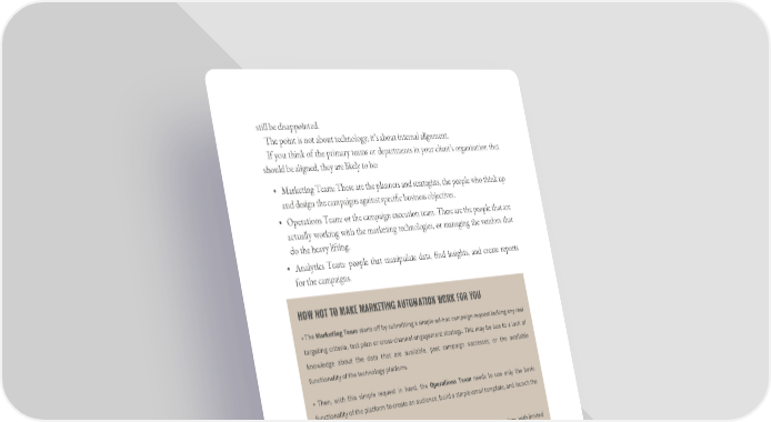still be disappointed. The point is not about technology; it’s about internal alignment. If you think of the primary teams or departments in your client’s organization that should be aligned, they are likely to be: • Marketing Team: These are the planners and strategists, the people who think up and design the campaigns against specific business objectives. • Operations Team: or the campaign execution team. These are the people that are actually working with the marketing technologies, or managing the vendors that do the heavy lifting. • Analytics Team: people that manipulate data, find insights, and create reports for the campaigns. HOW NOT TO MAKE MARKETING AUTOMATION WORK FOR YOU • The Marketing Team starts off by submitting a simple ad-hoc campaign request lacking any real targeting criteria, test plan or cross-channel engagement strategy. This may be due to a lack of knowledge about the data that are available, past campaign successes, or the available functionality of the technology platform. • Then, with this simple request in hand, the Operations Team needs to use only the basic functionality of the platform to create an audience, build a simple email template, and launch the campaign. • The simplicity of this ad hoc campaign naturally leads to a lack of data to analyze, with limited insights and basic reports coming in from the Analytics Team. A simple request leads to a simple execution, which leads to limited insights. And that loop continues, leading to limited use of technology – only 20% of what's available.