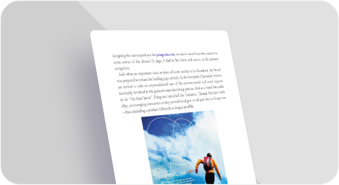 designing the user experience for patagonia.com, we knew not to bury this content in some corner of the About Us page. It had to live front and centre, in the primary navigation. And when an important issue or piece of news needed to be broadcast, the brand was prepared to release the landing page entirely. In the Footprint Chronicles, visitors are invited to take an unprecedented tour of the environmental and social impacts inevitably involved in the garment-manufacturing process. And as a brand that seeks to do “the least harm”, Patagonia launched the Common Threads Initiative with eBay, encouraging consumers to buy second-hand gear or sell gear they no longer use – thus extending a product’s lifecycle as long as possible.