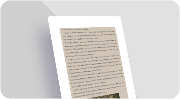 the most rational of business decision-makers. Together we created “Breathless Choir”, a film exploring how Philips’ healthcare technology helps individuals with respiratory illness achieve fulfilling lives. And we did it with a level of emotion, authenticity and belief rarely evoked by B2B brands. We enlisted the help of one of the foremost leaders of music – Gareth Malone – already well versed in assembling unlikely groups of people to transform their collective voices. Yet this would be his most difficult challenge – helping people with respiratory problems sing together, like Claire, a cystic fibrosis sufferer, or Lawrence, a 9/11 first responder who lost a third of his lung function, and others with severe breathing issues. It started very gently, some spoken words, a focus on the breath. And with patience, and practice, the group became one. Amazing! After a few days they started to believe in themselves. Finally, they put their belief to the test in a performance at the Apollo Theater in New York City – and the result was breathtaking. No matter who you are, the delight of seeing people exceed their limitations is powerful, and it changes your view of Philips. We needed more than a 30-second spot to tell such a transformational story, and our choice of longer form content drove engagement and online sharing behaviour well above benchmarks across 20+ markets. The Economist, MSNBC, The Wall Street Journal and LinkedIn – the business media carried an unusually emotional film for their audience. Authentic and unexpected, “Breathless Choir” showed how Philips innovates differently, how it solves problems around real people, how it thinks and acts as a technology partner, and how it holds a set of human beliefs that touch everything it does.