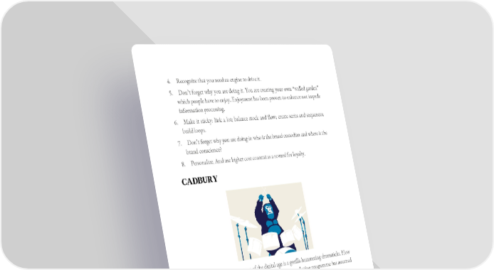 4. Recognize that you need an engine to drive it. 5. Don’t forget why you are doing it. You are creating your own “walled garden” which people have to enjoy. Enjoyment has been proven to enhance not impede information processing. 6. Make it sticky: link a lot; balance stock and flow; create series and sequences; build loops. 7. Don’t forget why you are doing it: who is the brand custodian and where is the brand conscience? 8. Personalize. And use higher cost content as a reward for loyalty. CADBURY One of the defining images of the digital age is a gorilla hammering drumsticks. How did that happen? Cadbury Dairy Milk’s 2007/08 marketing programme has assumed mythical status. The actual history is sometimes difficult to disentangle. It began in a dire period for the brand: a salmonella scare leading to a recall of over a billion chocolate bars. And, generally, this was a brand which no longer enjoyed universal brand preference. It was highly polarized by age. Anyone over 35 considered it to be the best chocolate, and those under 35 did not. So a brief went out with two components: to “get the love back”, and at the same time, to remind younger consumers, in particular, that Cadbury chocolate is actually made with milk. There was a codicil given by the new Marketing Director, Phil