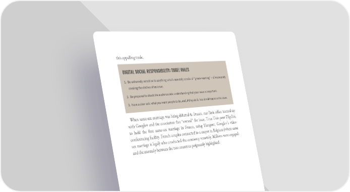 this appalling trade. DIGITAL SOCIAL RESPONSIBILITY: THREE RULES 1. Be extremely sensitive to anything which remotely smells of “green-washing” – of insincerely stealing the clothes of an issue. 2. Be prepared to shock the audience into understanding that your issue is important. 3. Have a clear ask: what you want people to do, and, if they do it, how it will improve the issue. When same-sex marriage was being debated in France, our Paris office teamed up with Google+ and the association that “owned” the issue, Tous Unis pour l’Egalité, to hold the first same-sex marriage in France, using Hangout, Google+’s video- conferencing facility. French couples connected to a mayor in Belgium (where same sex marriage is legal) who conducted the ceremony remotely. Millions were engaged: and the anomaly between the two countries poignantly highlighted.