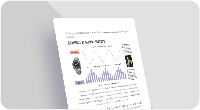 looking for a commercial model, rather than one of commerce seeking a technological solution. ANALOGUE VS DIGITAL PROCESS The digital age hasn’t called time on the analogue era, but it has offered an entirely different way of capturing information. Take the production process for developing a print advertisement. Whereas analogue technology represents information – like film negatives in a 35mm camera or the groove in a vinyl record – digital converts it into data, simple 0s and 1s. We may produce a final print ad that looks the same regardless of the method, but one is a representation while the other is a high-fidelity approximation. The internet’s now-ubiquitous force is transforming, among many other worlds, the world of advertising. In this arena, the challenges and opportunities presented by digital media are not unlike those faced by David Ogilvy – and Bill Bernbach, Rosser Reeves, Ted Bates and a whole legion of admen – upon the arrival of the previous great disruptor, television, in the 1950s. As a transmitter, storer and generator of digital information, this internet with many diverse parts is what enables advertising in the digital age. Of course, since that first digital message in 1969, digital has not completely replaced analogue technology: a Rolex watch, for instance, where the hands represent passing time as an analogy, can still be more informative than its digital counterpart.