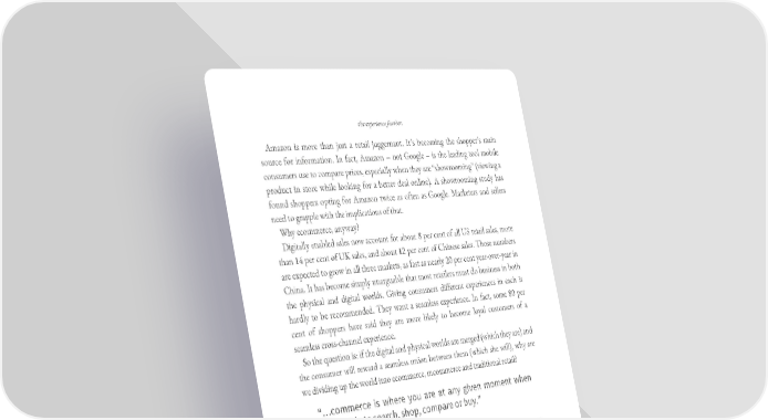 the experience further. Amazon is more than just a retail juggernaut. It’s becoming the shopper’s main source for information. In fact, Amazon – not Google – is the leading tool mobile consumers use to compare prices, especially when they are “showrooming” (viewing a product in store while looking for a better deal online). A showrooming study has found shoppers opting for Amazon twice as often as Google. Marketers and sellers need to grapple with the implications of that. Why ecommerce, anyway? Digitally enabled sales now account for about 8 per cent of all US retail sales, more than 14 per cent of UK sales, and about 12 per cent of Chinese sales. Those numbers are expected to grow in all three markets, as fast as nearly 20 per cent year-over-year in China. It has become simply unarguable that most retailers must do business in both the physical and digital worlds. Giving consumers different experiences in each is hardly to be recommended. They want a seamless experience. In fact, some 80 per cent of shoppers have said they are more likely to become loyal customers of a seamless cross-channel experience. So the question is: if the digital and physical worlds are merged (which they are) and the consumer will reward a seamless union between them (which she will), why are we dividing up the world into ecommerce, mcommerce and traditional retail? “…commerce is where you are at any given moment when you decide to search, shop, compare or buy.” It does not make sense. I’m a strong advocate of kicking the “e” in ecommerce into the dustbin of lost labels. Commerce is no longer sharply delineated in time or space – you’re not in one mode while you are at home and another while getting to work, and in yet a third when you finally walk into a store, flip on your computer or turn on your phone (as if it’s ever off anyway). No, commerce is where you are at any given moment when you decide to search, shop, compare, or buy. Commerce is everywhere, all the time. It is continuous.