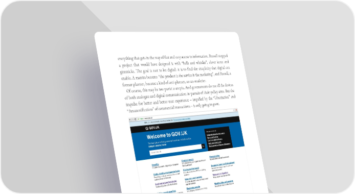 everything that gets in the way of fast and easy access to information. Russell stopped a project that would have designed it with “bells and whistles”, clever icons and gimmicks. The goal is not to be digital: it is to find the simplicity that digital can enable. A mantra became: “the product is the service is the marketing”, and Russell, a former planner, became a kind of anti-planner, an un-marketer. Of course, this may be too purist a utopia. And governments do use all the devices of both analogue and digital communication in pursuit of their policy aims. But the impulse for better and better user experience – impelled by the “Uberization” and “Amazonification” of commercial transactions – is only going to grow. In the UK, the GOV.UK website was labelled “boring.com” by a popular newspaper, but swept the award shows, including a D&AD Black Pencil. Russell Davies, Director of Strategy at the UK’s Government Digital Service, had radically streamlined the website for GOV.UK to eliminate everything that got in the way of easy access to information. Its stripped-down simplicity echoes classic government information campaigns of the past – as does its use of one consistent, restrained font.