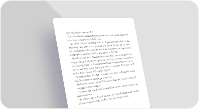 now? And, indeed, what is an idea? It is curious how infrequently the last question is answered, precisely, granted that this is meant to be a business fuelled by ideas. One of my treasured advertising books is a dog-haired volume called Practical Advertising from 1909. It was published each year, in London, by our British antecedent, Mather & Crowther. It is their Mather in our name; and it was here that David Ogilvy came to work for his brother, Francis, in the 1930s. One of the house ads in this book shows a client with a plump, well-fed face, in a winged collar, polka-dot tie and a pince-nez, scrutinizing a newspaper. The headline says, “Looking Twice”. And the copy proceeds with a paragraph: “How often do you have to look twice before finding your own announcement? How many casual readers, do you suppose, will be equally diligent?” How many indeed? And that, I suppose is a neat way of explaining why we need ideas. It’s the ideas that make people notice things. But have you ever been asked to define an idea? Please give yourself just 30 seconds – and pause without reading on. Try it now, right now. So what is an idea? If you have pen and paper to hand, write your answer down. It’s not that easy, is it? And, strangely, not many advertising people have ever defined it very convincingly. Or, if they have, gone into print with it.