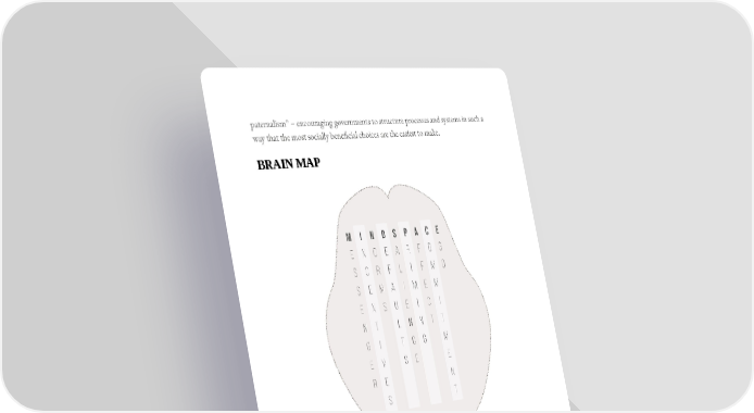 paternalism” – encouraging governments to structure processes and systems in such a way that the most socially beneficial choices are the easiest to make. BRAIN MAP The MINDSPACE framework was developed by a UK government office with input from academics and behavioural scientists. Working through each letter of the mnemonic – M for messenger, I for incentives, and so on – can generate practical ideas that instigate real behavioural change. Our client, Kimberly-Clark, adopted the framework and added an extra letter to create MINSPACER. The all-important ‘R’ – for reciprocity – asks how people might act for others, not just for themselves. Together, they popularized – in an eponymously titled book in 2008 – the idea of a “nudge”, a behavioural intervention which pushes people in the right direction.