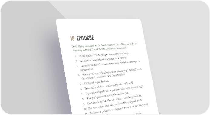 18 EPILOGUE David Ogilvy succumbed to the blandishments of the publisher of Ogilvy on Advertising and wrote 13 predictions. In a similar spirit, here are mine. 1. TV will continue to be the lynchpin medium, albeit transformed. 2. The Indian ad market will be the most attractive in the world. 3. The mobile handset will become as important to the whole of humanity as the bedtime pillow. 4. “Content” will cease to be a dirty word and will increasingly distinguish brands that offer a service to customers from those which don’t. 5. WeChat will surpass Facebook. 6. Virtual reality will find a niche, but will not take over the world. 7. Top-notch writing skills will carry a huge premium as they decrease in supply. 8. “Pure play” agencies will wither, or become main plays. 9. Candidates for political office will continue to use dishonest advertising. 10. New Asian multinationals will create the world’s most dynamic brands. 11. The debate as to whether our business is an art or a science will carry on forever, without resolution. 12. A breakaway from Cannes will form, which is more purely creative. 13. The word “digital” will ultimately disappear.