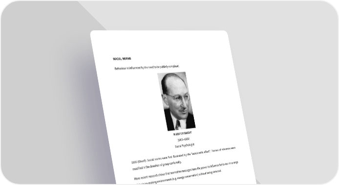 SOCIAL NORMS Behaviour is influenced by the need to be publicly compliant. MUZAFER SHERIF (1906–1988) Social Psychologist 1936 (Sherif): Social norms were first illustrated by the “autokinetic effect”. Frames of reference were modified in the direction of group conformity. More recent research shows that normative messages have the power to influence behaviour in a range of decision-making environments (e.g. energy conservation) without being detected.