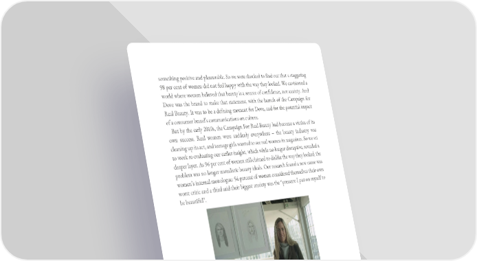 something positive and pleasurable. So we were shocked to find out that a staggering 98 per cent of women did not feel happy with the way they looked. We envisioned a world where women believed that beauty is a source of confidence, not anxiety. And Dove was the brand to make that statement, with the launch of the Campaign for Real Beauty. It was to be a defining moment for Dove, and for the potential impact of a consumer brand’s communications on culture. But by the early 2010s, the Campaign For Real Beauty had become a victim of its own success. Real women were suddenly everywhere – the beauty industry was cleaning up its act, and teenage girls wanted to see real women in magazines. So we set to work re-evaluating our earlier insight, which while no longer disruptive, revealed a deeper layer. As 96 per cent of women still claimed to dislike the way they looked, the problem was no longer unrealistic beauty ideals. Our research found a new cause was women’s internal monologue: 54 percent of women considered themselves their own worst critic and a third said their biggest anxiety was the “pressure I put on myself to be beautiful”. Sketches is the most shared ad ever and one of the most watched videos of all time. It exposed women’s overly critical assessment of their own beauty compared to the more generous appraisal of a stranger. Simply put, the film communicated that you are more beautiful than you think. Dove understands that to keep mattering brands must continue to evolve, so over the next three years we kicked off each spring with an annual “hero” campaign, Sketches in 2013 (see here), and its successors Patches in 2014 and Choose Beautiful in