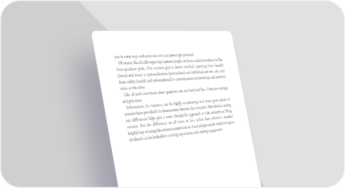 you in some way; and sometimes it is just downright practical. Of course, like all self-respecting business people, we have a natural tendency to like four-quadrant grids. Our content grid is shown overleaf, spanning from breadth (broad and mass) to personalization (personalized and individual) on one axis, and from utility (useful and informational) to entertainment (entertaining and emotive) value on the other. Like all such constructs, these quadrants are not hard and fast. There are overlaps and grey areas. Information, for instance, can be highly entertaining; and many great pieces of content have provided it in documentary formats that entertain. Nonetheless, teasing out differences helps give a more thoughtful approach to this amorphous thing, content. But the differences are all more or less, rather than either/or. Another helpful way of using this content matrix is to see it as a playground in which two great dividends can be looked for: creating experiences and creating engagement.
