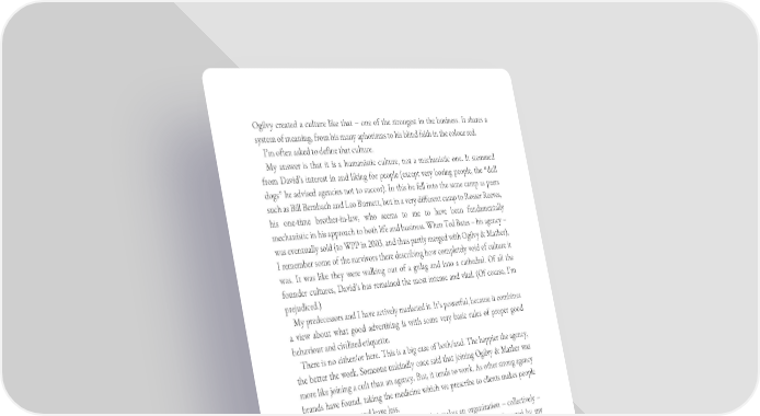 Ogilvy created a culture like that – one of the strongest in the business. It shares a system of meaning, from his many aphorisms to his blind faith in the colour red. I’m often asked to define that culture. My answer is that it is a humanistic culture, not a mechanistic one. It stemmed from David’s interest in and liking for people (except very boring people, the “dull dogs” he advised agencies not to succor). In this he fell into the same camp as peers such as Bill Bernbach and Leo Burnett, but in a very different camp to Rosser Reeves, his one-time brother-in-law, who seems to me to have been fundamentally mechanistic in his approach to both life and business. When Ted Bates – his agency – was eventually sold (to WPP in 2003, and thus partly merged with Ogilvy & Mather), I remember some of the survivors there describing how completely void of culture it was. It was like they were walking out of a gulag and into a cathedral. Of all the founder cultures, David’s has remained the most intense and vital. (Of course, I’m prejudiced.) My predecessors and I have actively marketed it. It’s powerful, because it combines a view about what good advertising is with some very basic rules of proper good behaviour and civilized etiquette. There is no either/or here. This is a big case of both/and. The happier the agency, the better the work. Someone unkindly once said that joining Ogilvy & Mather was more like joining a cult than an agency. But, it tends to work. As other strong agency brands have found, taking the medicine which we prescribe to clients makes people want to join more and leave less. There is no shortage of theories as to what makes an organization – collectively – courageous. Let me add mine: and it is quite possible that it is distorted by my experience in a creative services agency. I think it is directly related to the degree to which leadership can inculcate a day-to- day sense of being dissatisfied with where you are. The courage emanates not out of grand injunctions to be brave, but out of a sense of insecurity about where you are: that it’s not good enough, that others are doing better, that something’s missing, that you need another leap forward, that if you don’t do something big, you’ll … and so on. Courage is born of discontent. The philosopher José Ortega y Gasset captured this sense of restlessness, a