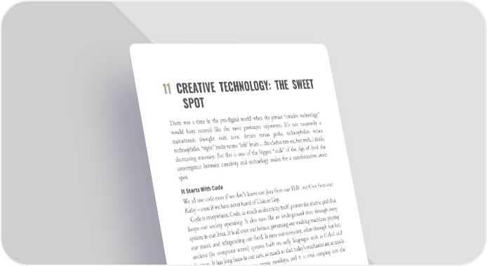 11 CREATIVE TECHNOLOGY: THE SWEET SPOT There was a time in the pre-digital world when the phrase “creative technology” would have seemed like the most grotesque oxymoron. It’s not necessarily a mainstream thought even now. Artists versus geeks, technophobes versus technophiles, “right” brain versus “left” brain … the clashes run on, but with, I think, decreasing intensity. For this is one of the biggest “ands” of the Age of And: the convergence between creativity and technology makes for a transformative sweet spot. It Starts With Code We all use code even if we don’t know our Java from our PHP, our C++ from our Ruby – even if we have never heard of Unix or Lisp. Code is everywhere. Code, as much as electricity itself, powers the electric grid that keeps our society operating. It also runs like an underground river through every system in our lives. It is all over our homes, governing our washing machines, playing our music and refrigerating our food. It runs our economy, often through fast but ancient (in computer terms) systems built on early languages such as Cobol and Fortran. It has long been in our cars, so much so that today’s mechanics are as much computer engineers as they are grease monkeys, and it is even creeping into the humble light bulb. Simply put, code is a set of instructions for a computer, encoded in a language humans can make sense of and manipulate, that the computer can then translate into its own machine language. That language instructs the computer to configure its logic gates in such a way as to produce the result the coder desires. You may very well come into advertising explicitly to avoid having to understand code, but just as code makes the world operate, it lies behind advertising, too. If you really want to know how to code, find a few hours and read Paul Ford’s magnificent essay, “What is Code” (2015).