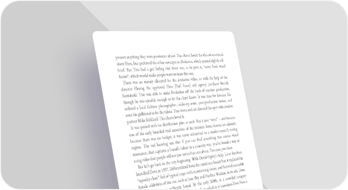present anything they were passionate about. The clients loved the idea of emotional short films, but preferred the other concepts to Evolution, which seemed slightly off- brief. But Tim had a gut feeling that there was, as he puts it, “some freak visual factor”, which would make people want to share this one. There was no money allocated for the Evolution video, so with the help of the director filming the approved films (Yael Staav) and agency producer Brenda Surminski, Tim was able to make Evolution off the back of another production, though he was sensible enough to let the client know. It was time for favours. He enlisted a local fashion photographer, make-up artist, post-production house, and even his girlfriend to be the talent. Tim wrote and art directed the spot with creative partner Mike Kirkland. The clients loved it. It was posted with no distribution plan as such. But it just “went” – and became one of the early branded viral sensations of the internet. Some lessons are salutary: because there was no budget, it was never submitted to a market-research testing regime. The real learning was that if you can find something that creates visual resonance, that captures a brand’s values in a concrete way, you’ve found a way of using video that people will not just notice but care about. You care, you share. But let’s go back to the very beginning. With David Ogilvy’s help, Lever Brothers launched Dove in 1957. Differentiated from the outset as a beauty bar, it replaced the “squeaky clean” feel of typical soaps with moisturising cream, and featured accessible female celebrities of the era, such as Jean Shy and Pearline Watkins, in its ads. Dove has always been an authentic brand. By the early 2000s, in a crowded category fragmented by private label and online, our client asked us to transition Dove from a singular product to a portfolio of offerings. I’ve always believed in the notion that brands have Big IdeaLs™ as well as big ideas. So our solution was to develop a cultural point of view that would be profitable while influencing society for the better. And if someone was to ask what Dove’s was, I’d say: “Dove believes the world would be a better place if women were allowed to feel good about themselves.” It’s a powerful organizing tool that relates back to the brand’s best self. As Steve Miles, responsible for Dove globally, put it, “Brands with purpose are not just socially beneficial, but are the pathway to superior growth”. The beauty industry operates from the unquestioned assumption that beauty is