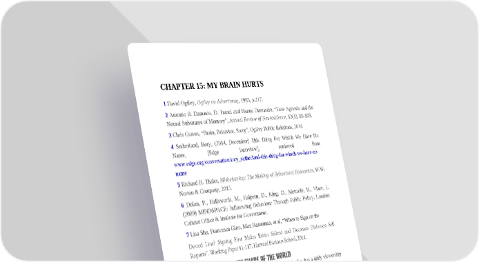 CHAPTER 15: MY BRAIN HURTS 1 David Ogilvy, Ogilvy on Advertising, 1985, p.217. 2 Antonio R. Damasio, D. Tranel and Hanna Damascio, “Face Agnosia and the Neural Substrates of Memory”, Annual Review of Neuroscience, 13(1), 89-109. 3 Chris Graves, “Brain, Behavior, Story”, Ogilvy Public Relations, 2014 4 Sutherland, Rory, (2014, December) This Thing For Which We Have No Name, [Edge Interview], retrieved from www.edge.org/conversation/rory_sutherland-this-thing-for-which-we-have-no- name 5 Richard H. Thaler, Misbehaving: The Making of Behavioral Economics, W.W. Norton & Company, 2015. 6 Dolan, P., Hallsworth, M., Halpern, D., King, D., Metcalfe, R., Vlaev, I. (2009) MINDSPACE: Influencing Behaviour Through Public Policy. London: Cabinet Office & Institute for Government. 7 Lisa Shu, Francesca Gino, Max Bazerman, et al, “When to Sign on the Dotted Line? Signing First Makes Ethics Salient and Decreases Dishonest Self- Reports”, Working Paper 11-117, Harvard Business School, 2011. CHAPTER 16: THE NEW SHAPE OF THE WORLD 1 CCTV’s main evening news broadcast, Xinwen Lianbo, has a daily viewership of roughly 135 million, and is also one of the most expensive shows for ad buys, with its 2013 advertising slots selling for a record 5.4 million yen. 2 Data from the World Bank, February 2017, retrieved from http://databank.worldbank.org/data/download/GDP.pdf and Robbie Gramer, “Here’s How the Global GDP is Divvied Up”, Foreign Policy, February 24, 2017 3 According to CNNIC (The China Internet Network Information Center).