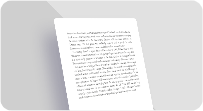 inspirational candidate, and harnessed the energy of Facebook and Twitter. But the hard work – the important work – was traditional database management: merging the donor database with the field-activist database with the voter database. As Thomas says, “At that point you suddenly begin to look at people in multi- dimensions, whereas before they were handled incredibly transactionally.” The money flowed in again: $500 million online in 2008, $690 million in 2012. Where was it spent? On traditional TV, giving a huge share of voice advantage. This is a particularly poignant part because in the 2016 election the insurgent Donald Trump relied on a huge earned media advantage: “authenticity” fed out via Twitter. But, more importantly, millions of people got vested in the campaign. The manager of a local field office in Cuyahoga, Ohio, could see that voter X who had given a few hundred dollars and knocked on some doors was a remarkably valuable target to create a whole experience around, with one aim – getting his or her labour. So the money financed the biggest field operation ever – tens of thousands of paid staffers, millions of volunteers, all singing from the same playbook – and socially enabled. (One technical note for non-American readers: the US “Voter File” and the long campaign cycles do make this recipe difficult to export in full – although it has been much demanded from all shades of the political spectrum in many countries.)