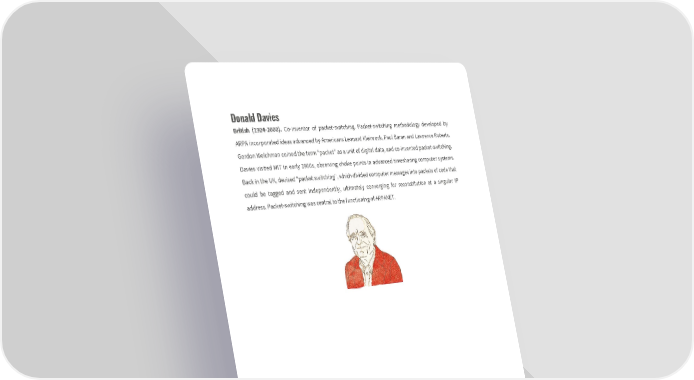Donald Davies British (1924-2000). Co-inventor of packet-switching. Packet-switching methodology developed by ARPA incorporated ideas advanced by Americans Leonard Kleinrock, Paul Baran and Lawrence Roberts. Gordon Welchman coined the term “packet” as a unit of digital data, and co-invented packet-switching. Davies visited MIT in early 1960s, observing choke points in advanced timesharing computer systems. Back in the UK, devised “packet switching”, which divided computer messages into packets of code that could be tagged and sent independently, ultimately converging for reconstitution at a singular IP address. Packet-switching was central to the functioning of ARPANET.