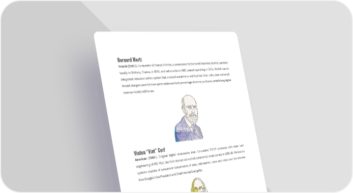 Bernard Marti French (1943-). Co-inventor of France’s Minitel, a predecessor to the World Wide Web (WWW), launched locally in Brittany, France, in 1978, and nationwide in 1982 (ceased operating in 2012). Minitel was an integrated videotext online system that enabled ecommerce and had text chat, video chat and email. Minitel charged users for time spent online and took percentage of online purchases, establishing digital revenue models still in use. Vinton “Vint” Cerf American (1943-). Original digital renaissance man. Co-created TCP/IP protocols with Kahn. Led engineering of MCI Mail, the first internet-connected commercial email service in 1982–86. Worked on systems capable of concurrent transmission of data, information, voice and video over the internet. Now Google’s Vice President and Chief Internet Evangelist.