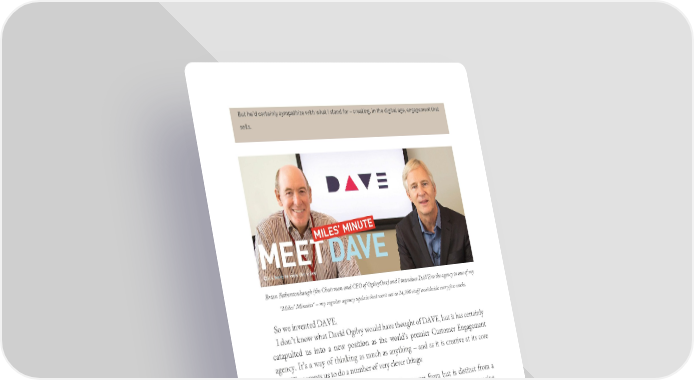 But he’d certainly sympathize with what I stand for – creating, in the digital age, engagement that sells. Brian Fetherstonhaugh (the Chairman and CEO of OgilvyOne) and I introduce DAVE to the agency in one of my "Miles’ Minutes" – my regular agency update that went out to 24,000 staff worldwide every few weeks. So we invented DAVE. I don’t know what David Ogilvy would have thought of DAVE, but it has certainly catapulted us into a new position as the world’s premier Customer Engagement agency. It’s a way of thinking as much as anything – and as it is creative at its core DAVE prompts us to do a number of very clever things: 1. To define a customer ambition, which emerges from but is distinct from a business ambition: data gives us a very precise view of whom we are engaging, and exactly what value we want to unlock. 2. To create personas of these customer segments, to spring them into life. There’s no intimacy without knowing whom you are being intimate with. 3. To map the customer journey: all the relevant moments – touch points (and pain points) – along the persona’s journey through life. It’s a very thorough discovery, and needs to be painstaking. We’ve seen many slipshod ones. No pain, no gain.