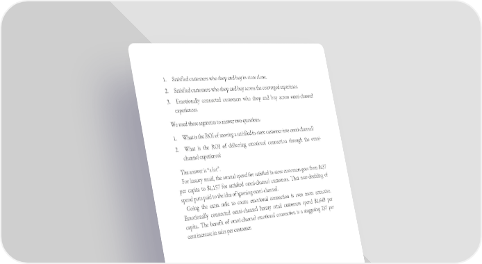 1. Satisfied customers who shop and buy in-store alone. 2. Satisfied customers who shop and buy across the converged experience. 3. Emotionally connected customers who shop and buy across omni-channel experiences. We used these segments to answer two questions: 1. What is the ROI of moving a satisfied in-store customer into omni-channel? 2. What is the ROI of delivering emotional connection through the omni- channel experience? The answer is “a lot”. For luxury retail, the annual spend for satisfied in-store customers goes from $637 per capita to $1,157 for satisfied omni-channel customers. That near-doubling of spend puts paid to the idea of ignoring omni-channel. Going the extra mile to create emotional connection is even more attractive. Emotionally connected omni-channel luxury retail customers spend $1,640 per capita. The benefit of omni-channel emotional connection is a staggering 257 per cent increase in sales per customer.