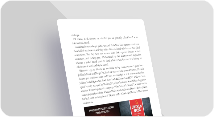 challenge. Of course, it all depends on whether you are primarily a local brand or an international brand. Local brands are no longer pallid, “me-too” feel-a-likes. They represent much more than half of our business, and they utilize all the tools and techniques of their global competitors. But they have one massive asset: their superior closeness to their customers. And in large part, this is enabled by their ability to think digital-first, whereas a global brand tends to think platform-first (because it is looking for efficiencies of scale) and digital second. Whenever I go to Manila, an irresistible craving comes over me. I yearn for a Jollibee’s Peach and Mango Pie. Yes, I can recommend it as one of the most delectable desserts you could ever have, and I have over-indulged in it all over the archipelago. Jollibee leads Filipino fast food, above both McDonald’s and KFC. It fills the “need space” usually occupied by McDonald’s, which has been a formidable and aggressive attacker. When they created a campaign, “What’s in Joy’s chicken?”, in which women named Joy confirmed that Chicken McDo was their chicken friend of choice; Jollibee hit back with a strong dose of Filipino pride, #ChickenJoyNation. Jollibee remains undeterred. Chicken fights in the Philippines: when McDonald’s relaunched its Chicken McDo, the local brand Jollibee with its Chickenjoy quickly asserted its position and responded.