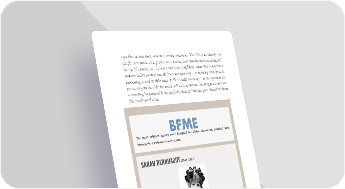 says that it, not they, will start driving outcomes. The ability to identify the simple core needs of a project or a mission does usually demand intellectual acuity. It’s ironic, but dunces aren’t great simplifiers. After that it requires a ruthless ability to weed out all that is not necessary – in thinking through it, in processing it and in delivering it. “Is it really necessary?” is the question the parrot on your shoulder has to ask each waking minute. Distilling that aim in the compelling language of lucid simplicity distinguishes the great simplifiers from the merely good ones. The most brilliant agency ever? Designed for Divine Discontent, recruited from history. Here’s whom I chose to run it: SARAH BERNHARDT (1844–1923) The “divine Sarah” of Oscar Wilde, discontent ran through every vein of this actress’s body. She slept in coffins to better project herself into the mood of death. When she was dying, she chose to live on a 5th floor. One of her visitors asked why, and she said, “so that when a man enters my bedroom he’ll still be panting.” That’s the passion that attracts clients. She’s the Client Service Director.