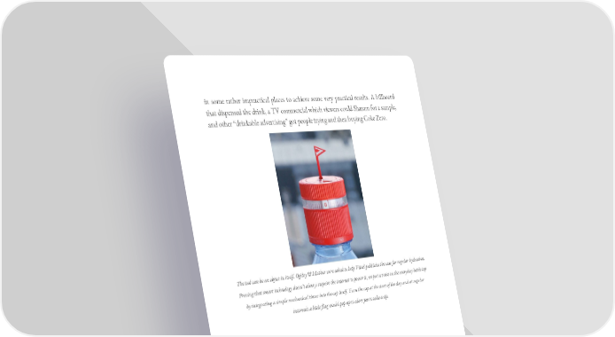in some rather impractical places to achieve some very practical results. A billboard that dispensed the drink, a TV commercial which viewers could Shazam for a sample, and other “drinkable advertising” got people trying and then buying Coke Zero. The tool can be an object in itself. Ogilvy & Mather were asked to help Vittel publicize the case for regular hydration. Proving that smart technology doesn’t always require the internet to power it, we put a twist on the everyday bottle top by integrating a simple mechanical timer into the cap itself. Turn the cap at the start of the day and at regular intervals a little flag would pop up to alert you to take a sip.