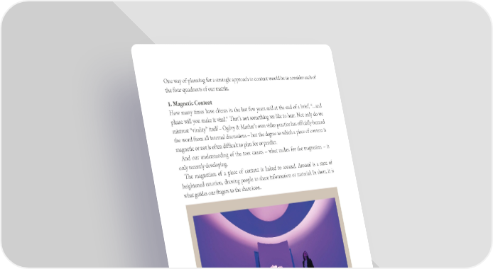 One way of planning for a strategic approach to content would be to consider each of the four quadrants of our matrix. 1. Magnetic Content How many times have clients in the last few years said at the end of a brief, “…and please will you make it viral.” That’s not something we like to hear. Not only do we mistrust “virality” itself – Ogilvy & Mather’s own video practice has officially banned the word from all internal discussions – but the degree to which a piece of content is magnetic or not is often difficult to plan for or predict. And our understanding of the root causes – what makes for the magnetism – is only recently developing. The magnetism of a piece of content is linked to arousal. Arousal is a state of heightened emotion, drawing people to share information or material. In short, it is what guides our fingers to the share icon. The apogee of experience design – so far at least – may be The Museum of Feelings. Glade transformed more than 5,000 square feet (465 square metres) of Manhattan space into an immersive pop-up experience to appeal to its visitors’ senses of sight, sound, touch and