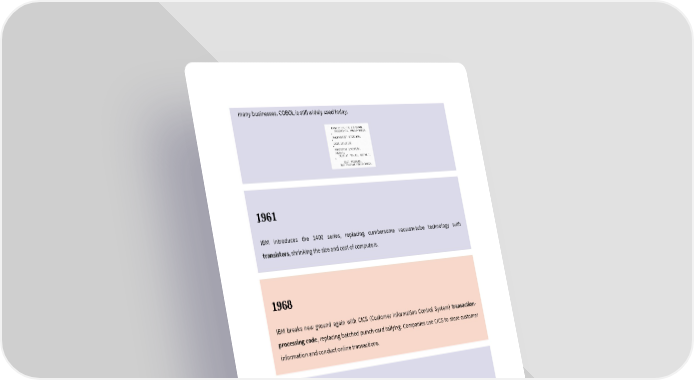 many businesses. COBOL is still widely used today. 1961 IBM introduces the 1400 series, replacing cumbersome vacuum-tube technology with transistors, shrinking the size and cost of computers. 1968 IBM breaks new ground again with CICS (Customer Information Control System) transaction- processing code, replacing batched punch-card tallying. Companies use CICS to store customer information and conduct online transactions. 1969 ARPANET (Advanced Research Projects Agency Network) launches a data communication system funded by the US government, which forms the basis of the internet. Connects research centres at UCLA, Stanford, University of Utah, and University of California, Santa Barbara. ARPANET uses IMPs (Interface Message Processors), a network of small computers similar to routers. Based on packet switching – disseminating one bundle of data to multiple IMPs at once,