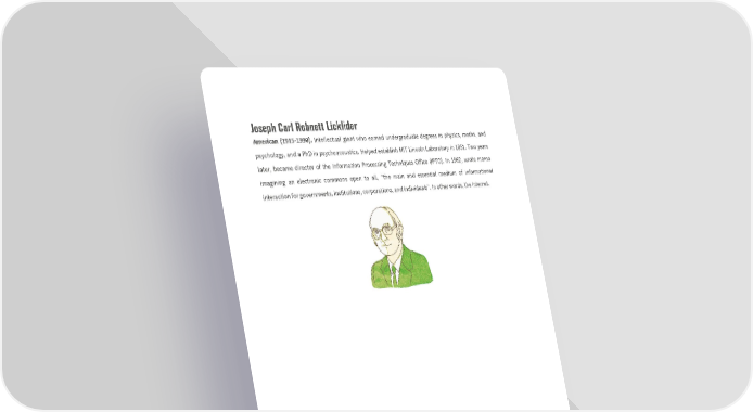 Joseph Carl Robnett Licklider American (1915-1990). Intellectual giant who earned undergraduate degrees in physics, maths, and psychology, and a PhD in psychoacoustics. Helped establish MIT Lincoln Laboratory in 1951. Two years later, became director of the Information Processing Techniques Office (IPTO). In 1962, wrote memo imagining an electronic commons open to all, “the main and essential medium of informational interaction for governments, institutions, corporations, and individuals”. In other words, the internet.