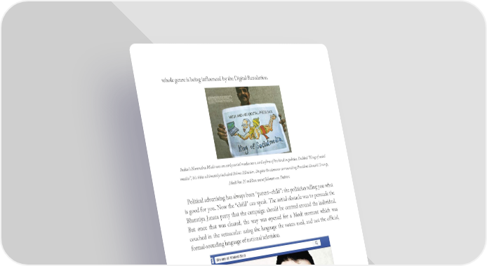 whole genre is being influenced by the Digital Revolution. India’s Narendra Modi was an early social media user, and a first of his kind in politics. Dubbed “King of social media”, his titles ultimately included Prime Minister. Despite the clamour surrounding President Donald Trump, Modi has 20 million more followers on Twitter. Political advertising has always been “parent–child”: the politician telling you what is good for you. Now the “child” can speak. The initial obstacle was to persuade the Bharatiya Janata party that the campaign should be centred around the individual. But once that was cleared, the way was opened for a Modi moment which was couched in the vernacular: using the language the voters used, and not the official, formal-sounding language of national television.
