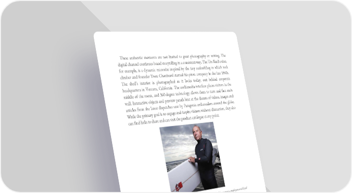 These authentic moments are not limited to great photography or writing. The digital channel continues brand storytelling in a consistent way. The Tin Shed e-zine, for example, is a dynamic microsite inspired by the tiny outbuilding in which rock climber and founder Yvon Chouinard started his piton company in the late 1960s. The shed’s interior is photographed as it looks today, out behind corporate headquarters in Ventura, California. The multimedia interface places visitors in the middle of the room, and 360-degree technology allows them to turn and face each wall. Interactive objects and preview panels hint at the dozens of videos, images and articles from the latest dispatches sent by Patagonia ambassadors around the globe. While the primary goal is to engage and inspire visitors without distraction, they also can find links to share and can visit the product catalogue at any point. Yvon Chouinard is the archetypal leader – a true outdoorsman who guides his company, employees and loyal customers with his moral compass. The values of Patagonia, like those of Chouinard, place environmental sustainability above all else. Patagonia has long been an industry leader when it comes to social and environmental responsibility. Corporate transparency is a significant part of that commitment, which leads to self-examination and improvement. In addition to supporting dozens of ongoing CSR initiatives, the company encourages employees to spend a month of every year volunteering for causes they believe in, and gives 1 per cent of sales to support environmental organizations around the world. So when