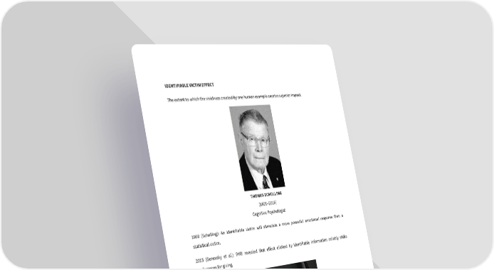 IDENTIFIABLE VICTIM EFFECT The extent to which the vividness created by one human example creates superior impact. THOMAS SCHELLING (1921–2016) Cognitive Psychologist 1968 (Schelling): An identifiable victim will stimulate a more powerful emotional response than a statistical victim. 2013 (Genevsky et al.): fMRI revealed that effect elicited by identifiable information reliably shifts preferences for giving. No More Abuse: Memac Ogilvy and King Khalid Foundation campaign Utilizing the Identifiable victim effect to raise awareness of domestic violence.