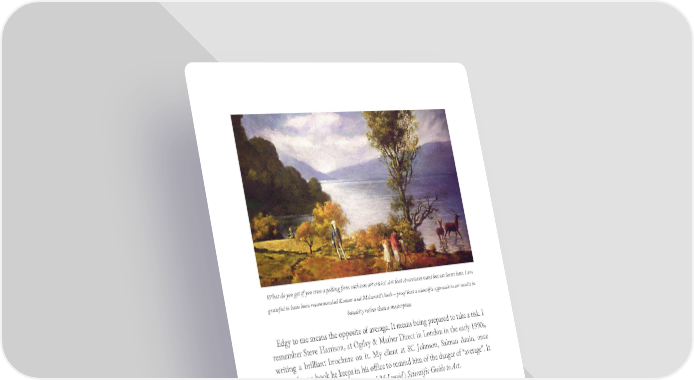 What do you get if you cross a polling firm with two art critics? Art that Americans want but art lovers hate. I am grateful to have been recommended Komar and Melamid’s book – proof that a scientific approach to art results in banality rather than a masterpiece. Edgy to me means the opposite of average. It means being prepared to take a risk. I remember Steve Harrison, at Ogilvy & Mather Direct in London in the early 1990s, writing a brilliant brochure on it. My client at SC Johnson, Salman Amin, once showed me a book he keeps in his office to remind him of the danger of “average”. It is Painting By Numbers, Komar and Melamid’s Scientific Guide to Art.