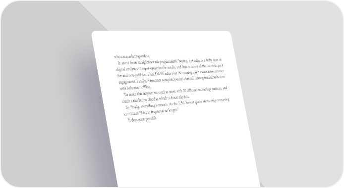 who are marketing online. It starts from straightforward programmatic buying, but adds in a hefty dose of digital analytics to super-optimize the results, and does so across all the channels, paid for and non-paid for. Then DAVE takes over the steering and it moves into customer engagement. Finally, it becomes completely omni-channel, relating behaviour in-store with behaviour offline. To make this happen we need to work with 30 different technology partners; and create a marketing cloud in which to house the data. So finally, everything connects. As the E.M. Forster quote about only connecting continues: “Live in fragments no longer.” It does seem possible.