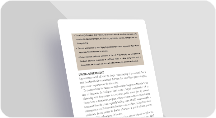 • Trump’s digital director, Brad Parscale, ran a more traditional data-driven campaign, with considerable fundraising impact, and deploying sophisticated analytics, learning all the time through testing. • This was accompanied by some highly targeted attempts at voter suppression of key Clinton supporters, African Americans for instance. • Clinton eschewed traditional advertising at the end of the campaign and upweighted her Facebook presence. Investment in traditional media in critical swing states such as Pennsylvania and Wisconsin was discussed within her campaign, but never implemented. DIGITAL GOVERNMENT E-government started off with the simple “technologizing of government”, but it took time for officials to understand that there then was a bigger game: redesigning governance – to put the user, the citizen, first. The poster children for this are two small countries: Singapore and Estonia. In the case of Singapore, the intelligent island drove a “digital transformation” of its relationship with Singaporeans in a top-down, public service plan. By contrast, Estonia’s was a decentralized program, with government as the catalyst and strong investment from the private, especially banking, sector. One ID and password for a citizen grants access. Both countries have easy-to-use interfaces, and high levels of user satisfaction. Estonia pushes the frontier a bit more: in just 20 minutes, you can register an EU-based company, for instance. But small is easy; big is hard. And there has been no more poignant example of just how hard than the Healthcare.gov fiasco, when the US government set up a digital hub for Obamacare insurance “marketplaces”. As someone remarked, it was the first time in history that a president had to stand in the Rose Garden and apologize for a broken website. Subsequent official enquiries revealed a series of reasons for the failure, all of which should give any of us the chills: • A team convinced that they had to design the perfect solution, but who didn’t leave enough time to implement it. • Rigid procurement policies leading to the selection of the wrong type of